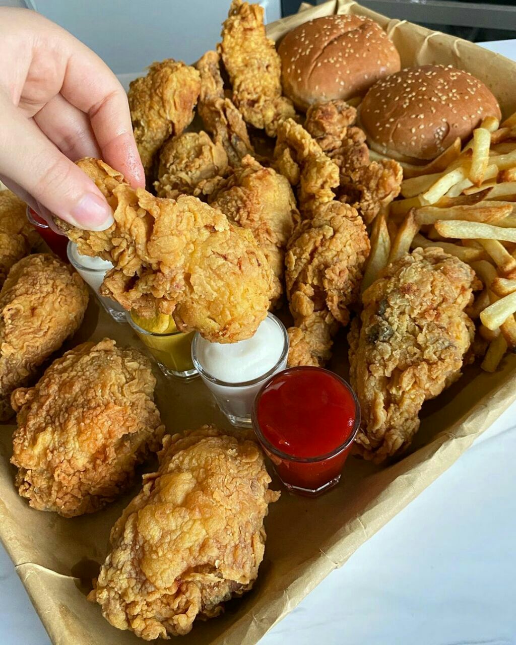 يتبل الدجاج بالدقيق ثم الماية الباردة ثم الدقيق مرة اخري ثم تتقلي بزيت حار حتي تحصل علي لون ذهبي مقرمش